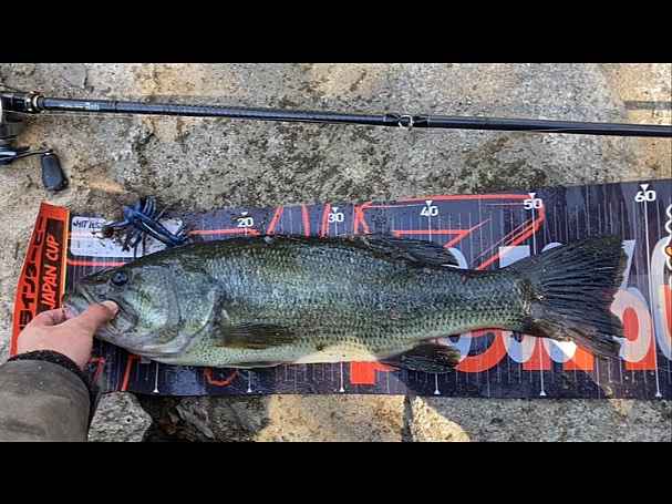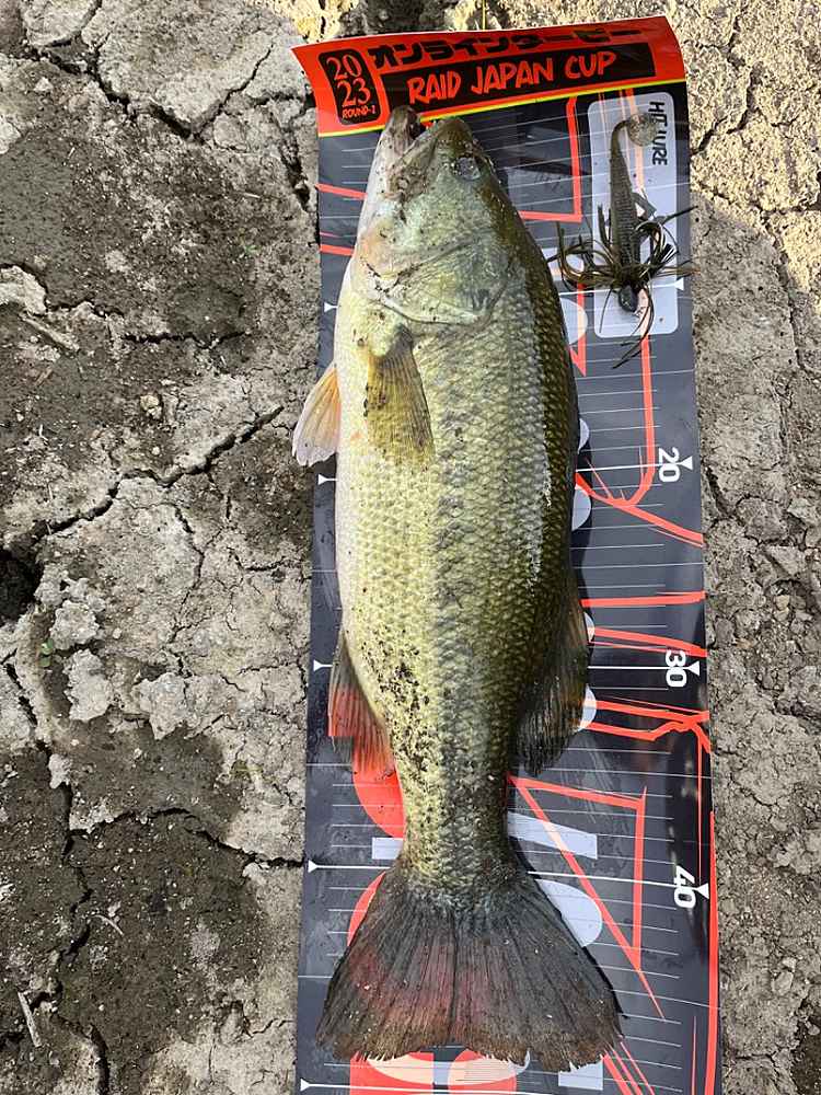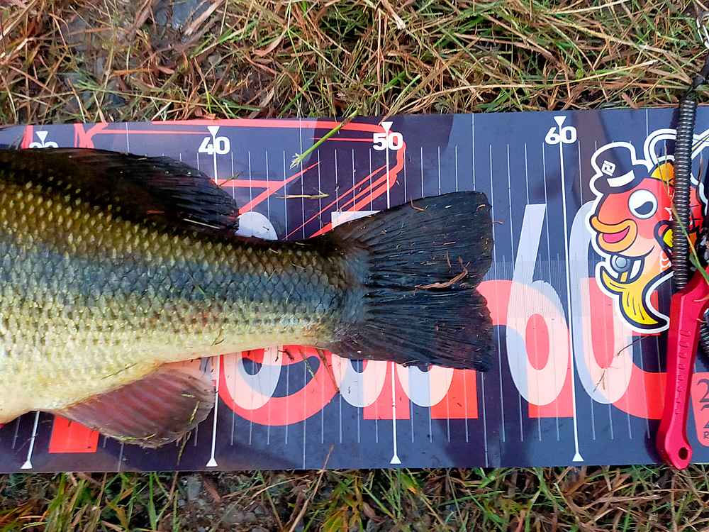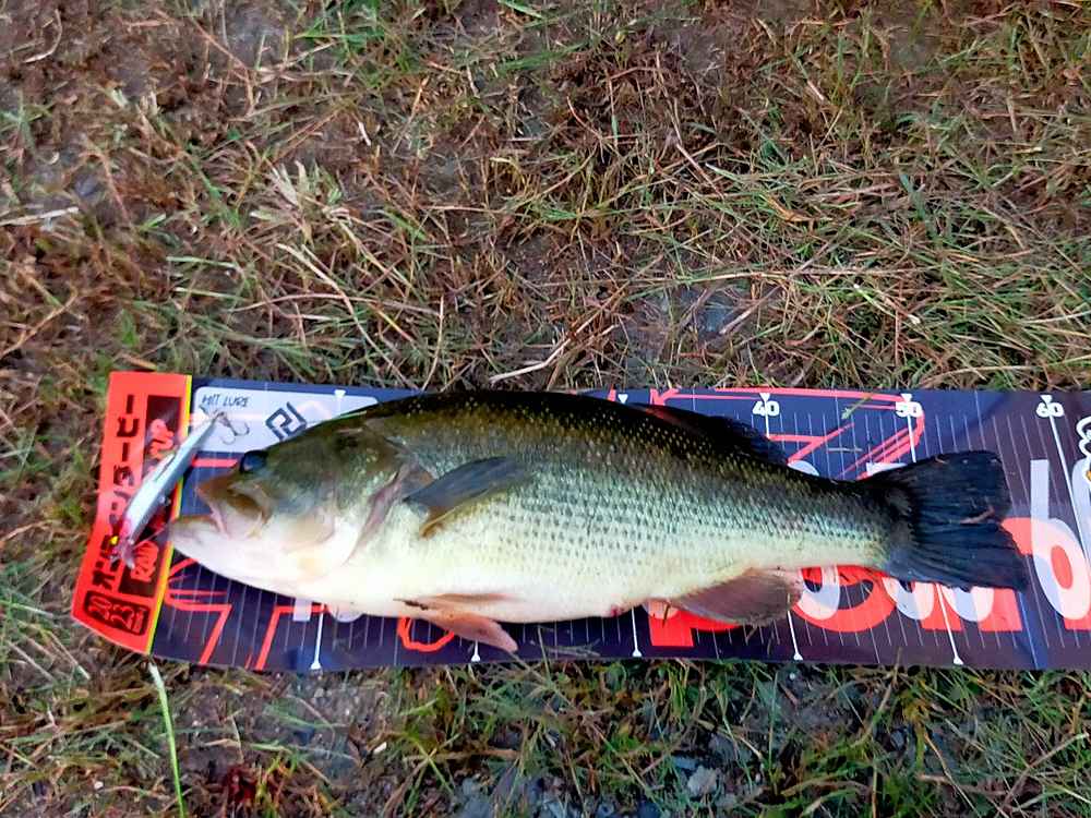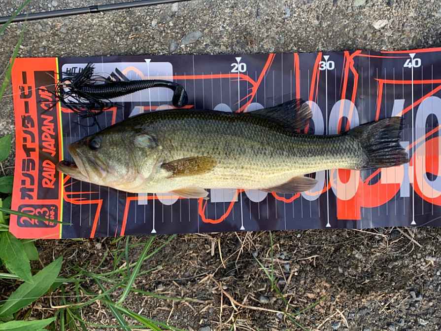 04. レイドジャパンのルアーで釣ったブラックバスとルアー専用メジャーの上で撮影。