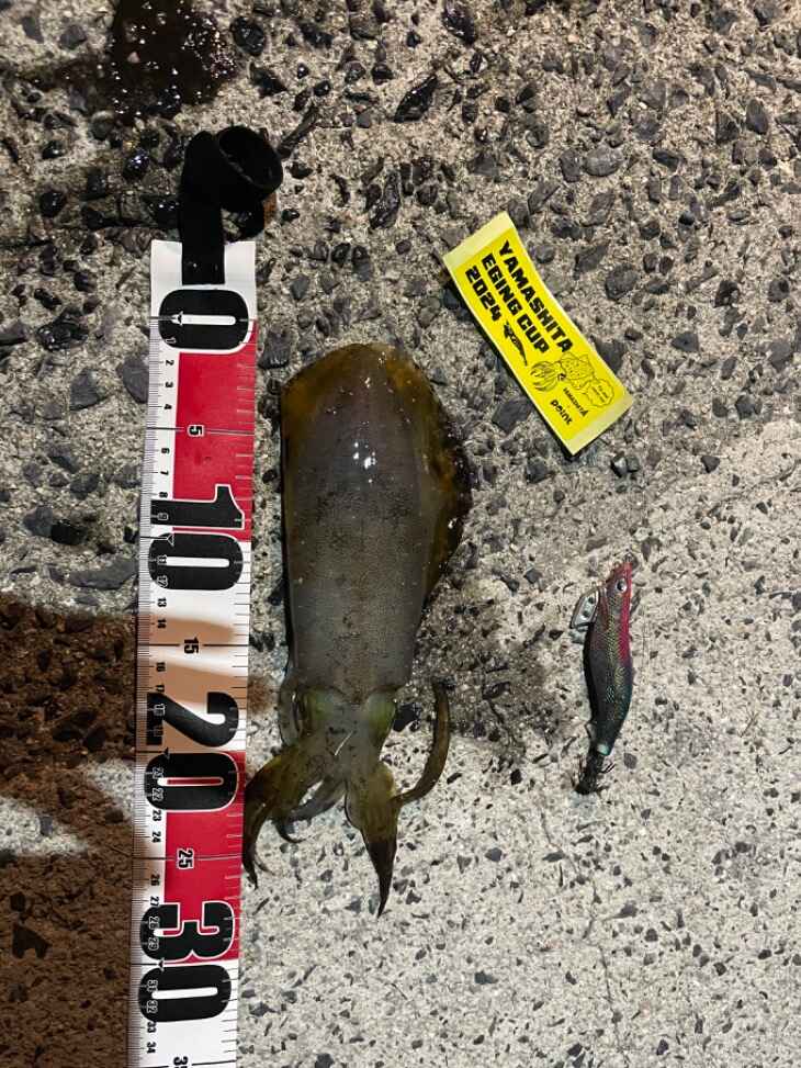 04. ヤマシタのエギで釣ったアオリイカとエギにエントリーステッカーとメジャーを添えて撮影。