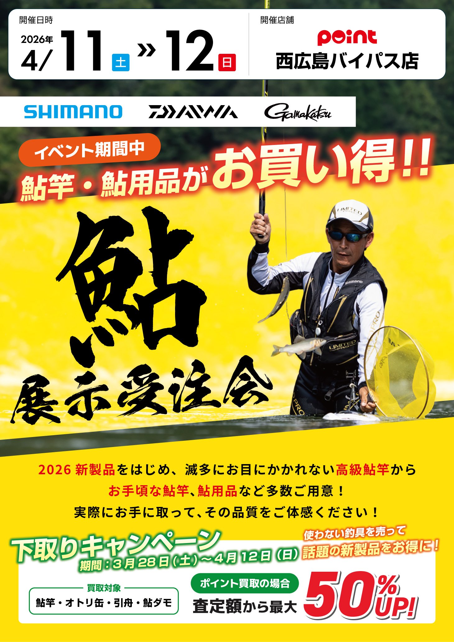 開催 【日時】2026年4月11日(土)12日(日) 【場所】釣具のポイント 西広島バイパス店 イベント期間は鮎竿・鮎用品がお買い得! イベント期間中は、鮎竿・...